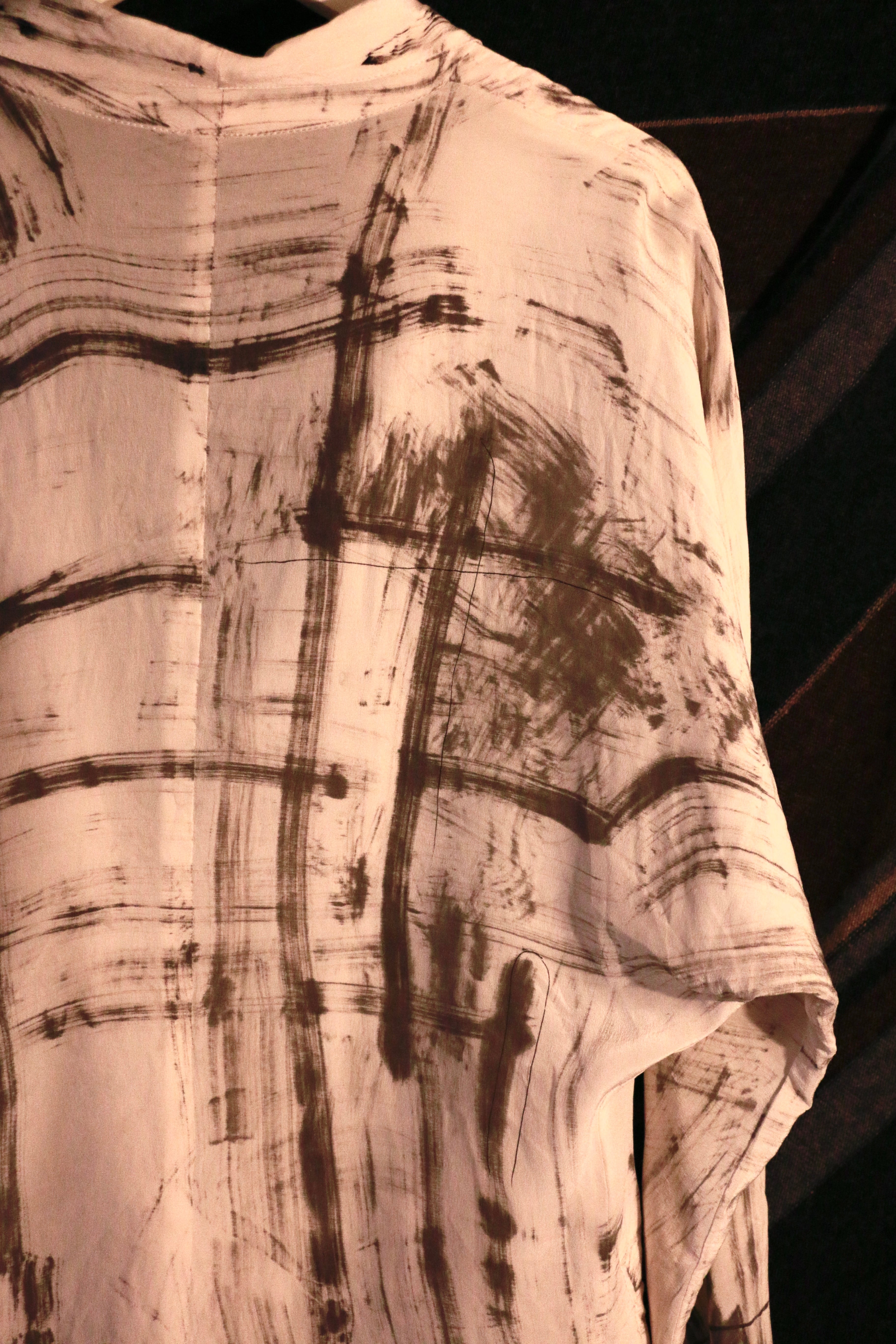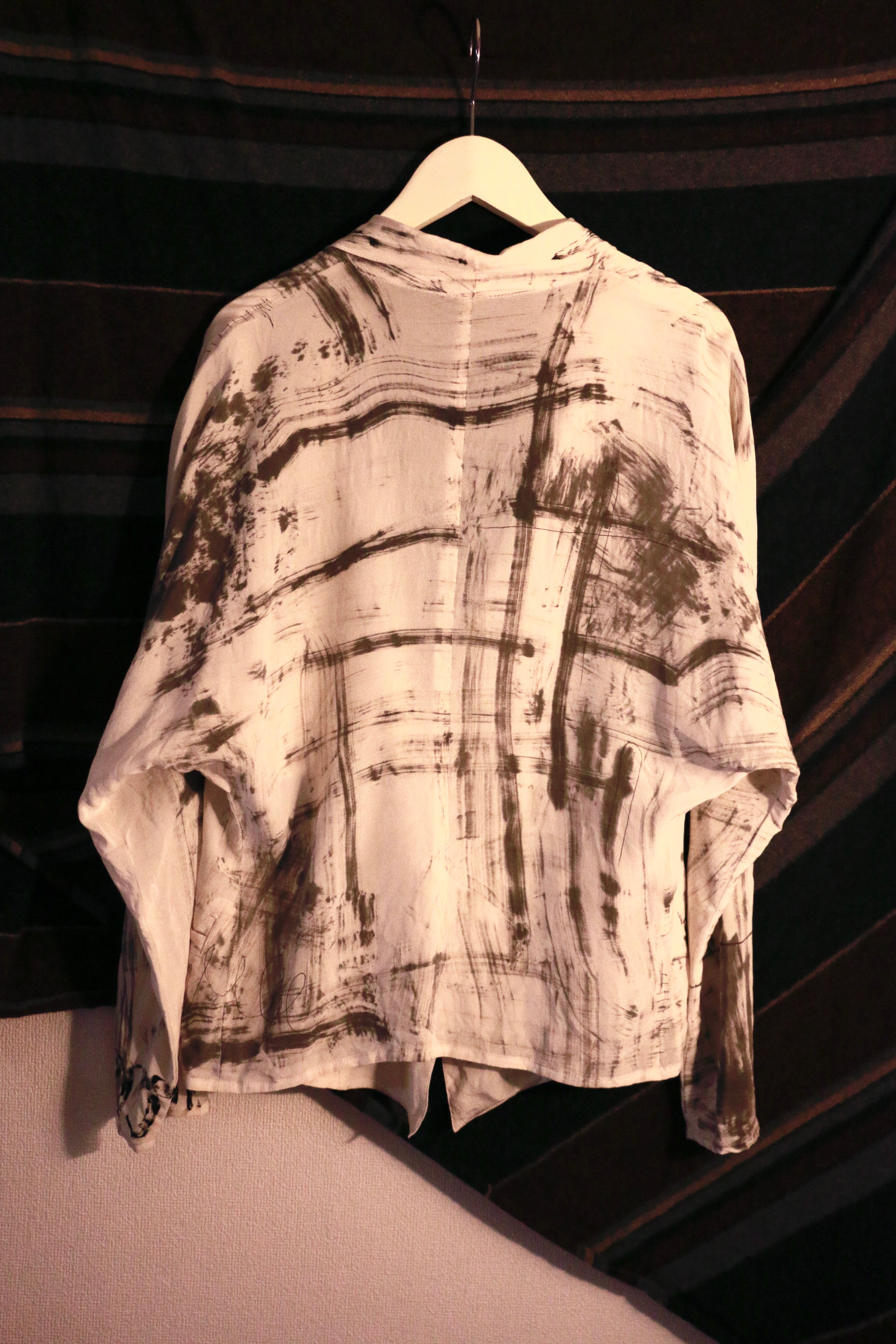 お色味はライトベージュ、薄手のSILK100%でゆったりとしたドルマンスリーブ、ボタンを閉めればウエストはタイトになります、ワイドなスラックスや